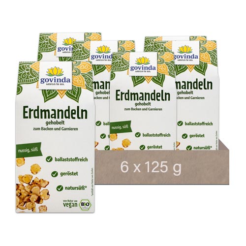 Extra große Erdmandeln werden in feine, dünne Scheiben gehobelt und schonend unter 42°C getrocknet. So behalten sie Rohkostqualität.