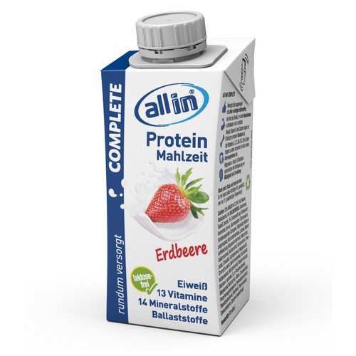 all in® COMPLETE Erdbeere ist deine vollwertige Protein Mahlzeit und versorgt dich rundum mit sämtlichen Nährstoffen. all in verwöhnt bei jedem Schluck mit milchig-cremigem Geschmack und angenehmer Süße.