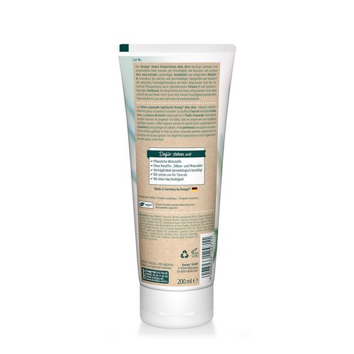 Die Kneipp® Hydro Körperlotion Aloe Vera versorgt normale und empfindliche Haut intensiv mit Feuchtigkeit. Die Rezeptur mit echtem Aloe vera-Extrakt, reichhaltiger Sheabutter und pflegendem Mandelöl hinterlässt ein weiches und geschmeidiges Hautgefühl und bewahrt die natürliche Feuchtigkeitsbalance der Haut. Abgerundet wird die natürliche Pflegewirkung durch zellschützendes Vitamin E und hautberuhigendes Panthenol. Die Körperlotion mit ihrem erfrischenden Duft zieht schnell ein und fettet nicht. Durch ihre intensiv feuchtigkeitsspendenden Eigenschaften ist sie auch nach dem Sonnenbad geeignet.