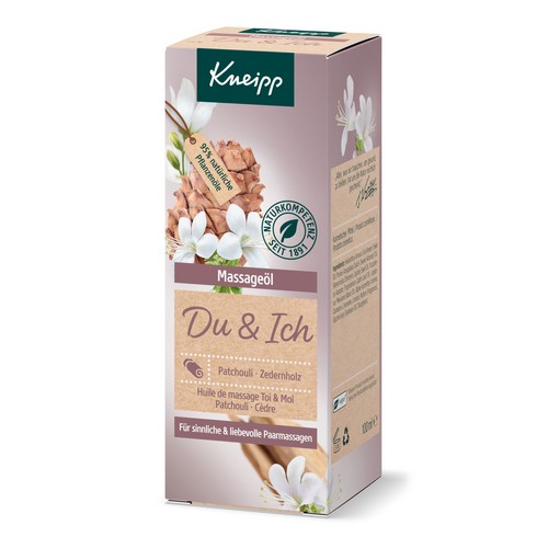 Das Kneipp® Massageöl Du & Ich mit natürlichem ätherischem Patchouli- und Zedernholzöl schenkt wohltuende Zweisamkeit und gemeinsame Momente der Entspannung. Feuchtigkeitsregulierende und intensiv pflegende Pflanzenöle und zellschützendes Vitamin E hinterlassen ein angenehm weiches und geschmeidiges Hautgefühl.Das Kneipp® Massageöl Du & Ich lässt sich leicht verteilen, zieht langsam ein und verströmt seinen sinnlich-pudrigen Duft durch die freigesetzte Wärme bei der Massage besonders intensiv. Pflanzeninformation zu Patchouliöl:Der besondere Duft des Patchouliöls wirkt harmonisierend, beruhigend und ausgleichend auf Körper und Seele.