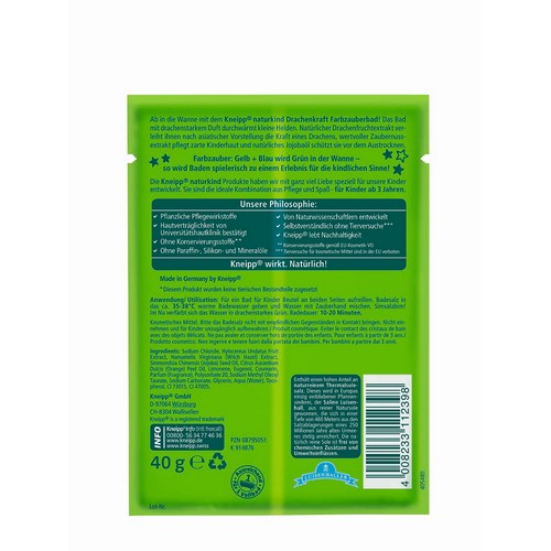 Ab in die Wanne mit dem Kneipp® naturkind Drachenkraft Farbzauberbad! Das Bad mit drachenstarkem Duft durchwärmt kleine Helden. Natürlicher Drachenfruchtextrakt verleiht ihnen nach asiatischer Vorstellung die Kraft eines Drachen, wertvoller Zaubernussextrakt pflegt zarte Kinderhaut und natürliches Jojobaöl schützt sie vor dem Austrocknen. Farbzauber: Gelb + Blau wird Grün in der Wanne – so wird Baden spielerisch zu einem Erlebnis für die kindlichen Sinne! Die Kneipp naturkind® Produkte haben wir mit ganz viel Liebe speziell für unsere Kinder entwickelt. Sie sind die ideale Kombination aus Pflege und Spaß - für Kinder ab 3 Jahren