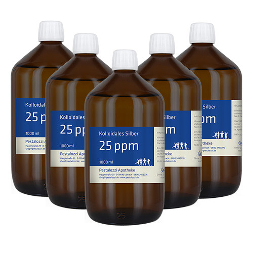 ⁠5 x 1000 ml "Kolloidales Silber - Pestalozzi Apotheke" in lichthemmender Apothekerbraunglasflasche