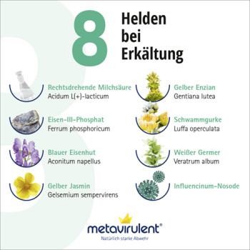 Bei akuten Zuständen bzw. den ersten Anzeichen einer Erkältung über zwei Tage bis zu 12x täglich je 5–10 Tropfen einnehmen.  Dabei sollten die Tropfen einige Zeit im Mund belassen werden, damit sie von der Mundschleimhaut aufgenommen werden können.  Alternativ kann metavirulent auch in ein Glas mit Flüssigkeit getropft und mit etwas Wasser zusammen eingenommen werden. Bei Nachlassen der Beschwerden sollte die Dosis reduziert werden, bis die Erkältung abgeklungen ist.