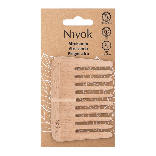 Styling und Pflege für die Locken mit dem Niyok Afrokamm. Die weitstehenden Kammzähne entwirren sanft lockiges Haar. Hergestellt aus Buchenholz ist das Produkt 100% plastikfrei.