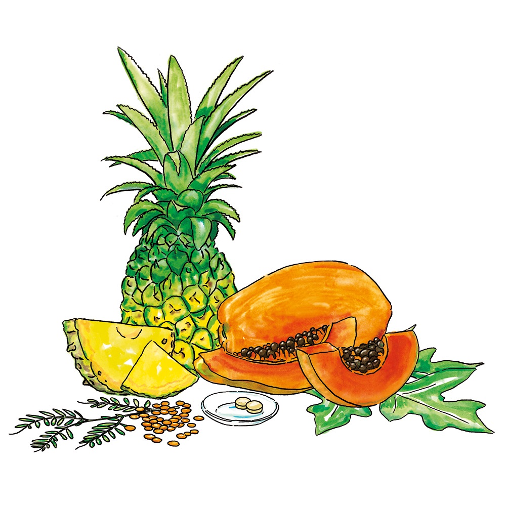 - Bromelain (aus der Ananas) und Papain (aus der Papaya): Die wertvollen pflanzlichen Enzyme beteiligen sich nahezu an allen Stoffwechselvorgängen im Körper.